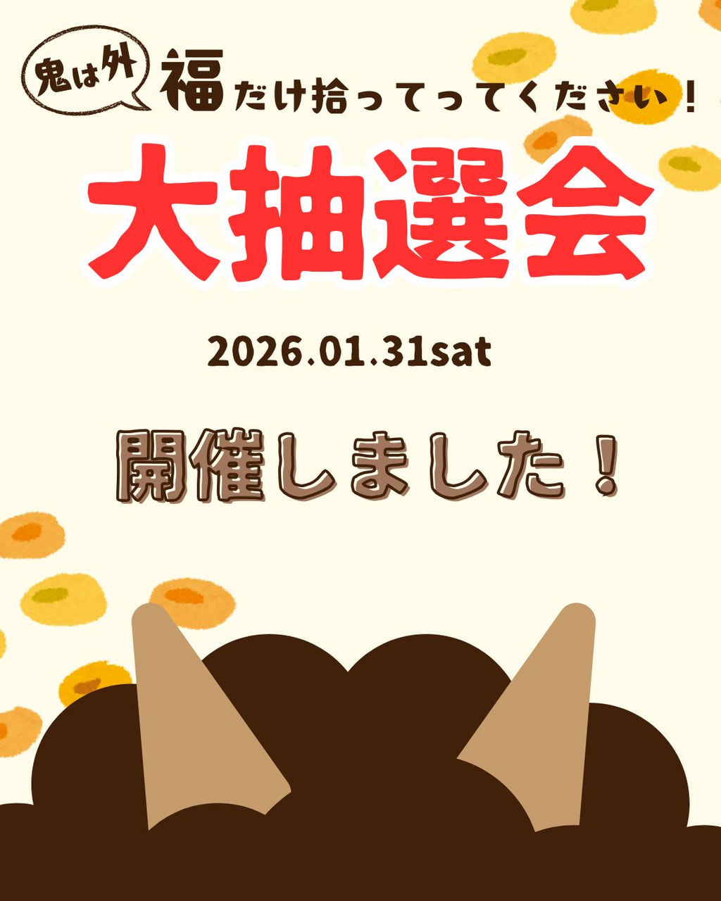 大抽選会を開催しました! 『大抽選会』2026.01.31(土)に開催しました!! 今回が初めての開催でしたが、たくさんの近隣の方にご来場いただきました。 抽選後は、節分ということもあり福豆と甘酒を振舞って温まっていただきました。小さなお子さんにも甘酒が人気でびっくり☆☆甘くておいしいよね~♬ 楽しんでいただけて良かったです!これからも地域の皆様に喜んでいただけるようなイベントや住まいに関するご提案を行ってまいります。 ご来場いただきましてありがとうございました。感謝 公開日:2026年02月04日 カテゴリ:イベント